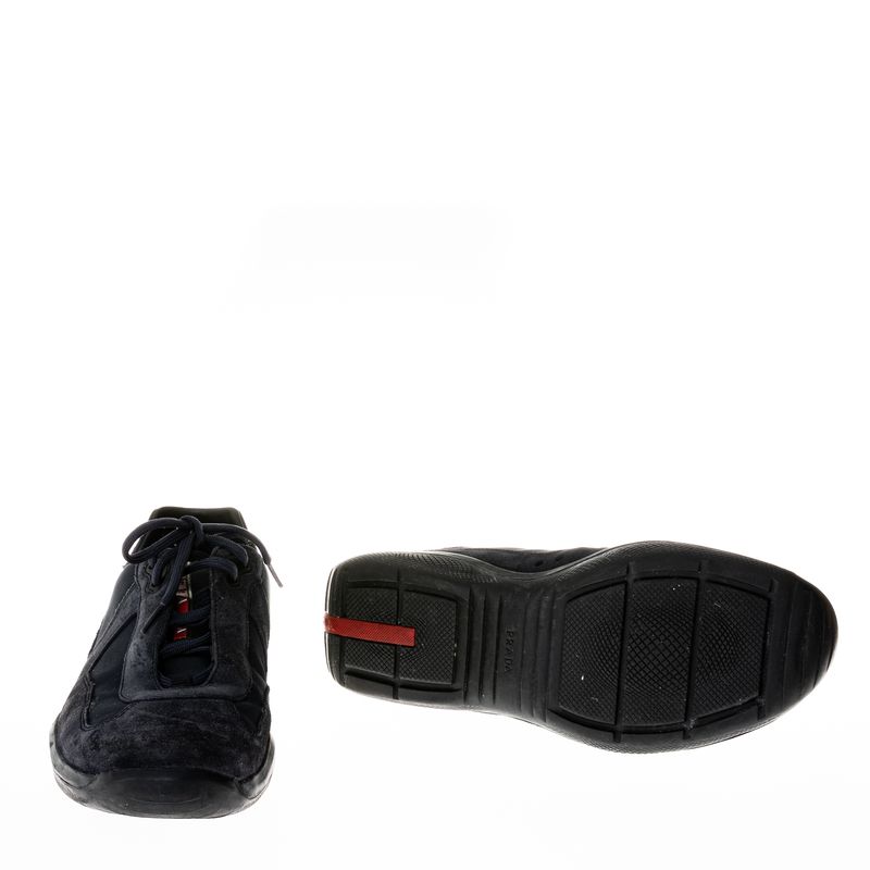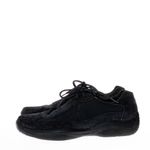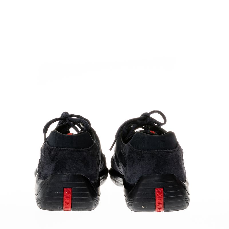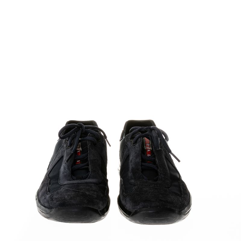 Tênis da marca Prada. Confeccionado na cor preta em camurça, com detalhes em nylon e solado de borracha. Possui um detalhe vermelho no calcanhar, escrito "Prada". A peça apresenta marcas de uso e desgastes na camurça.