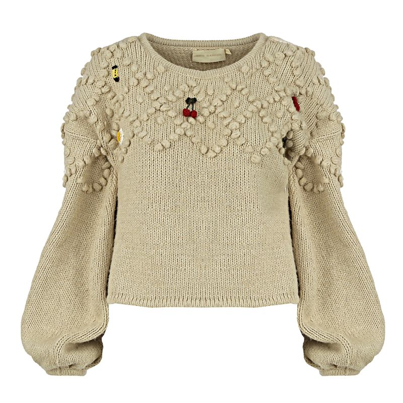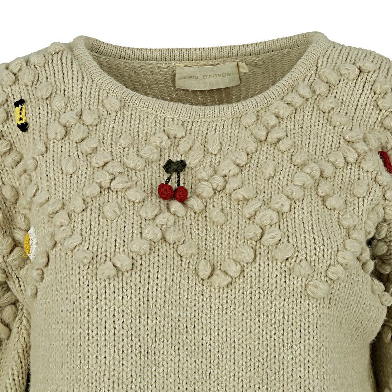 Tricô da marca Cris Barros. Confeccionado em tricô na cor creme com elementos bordados coloridos em formato de cereja, coracão, flor, banana e ovo. A peça se encontra em ótimo estado, com levíssimas marcas de uso, e com uma das cerejas de tricot faltando.