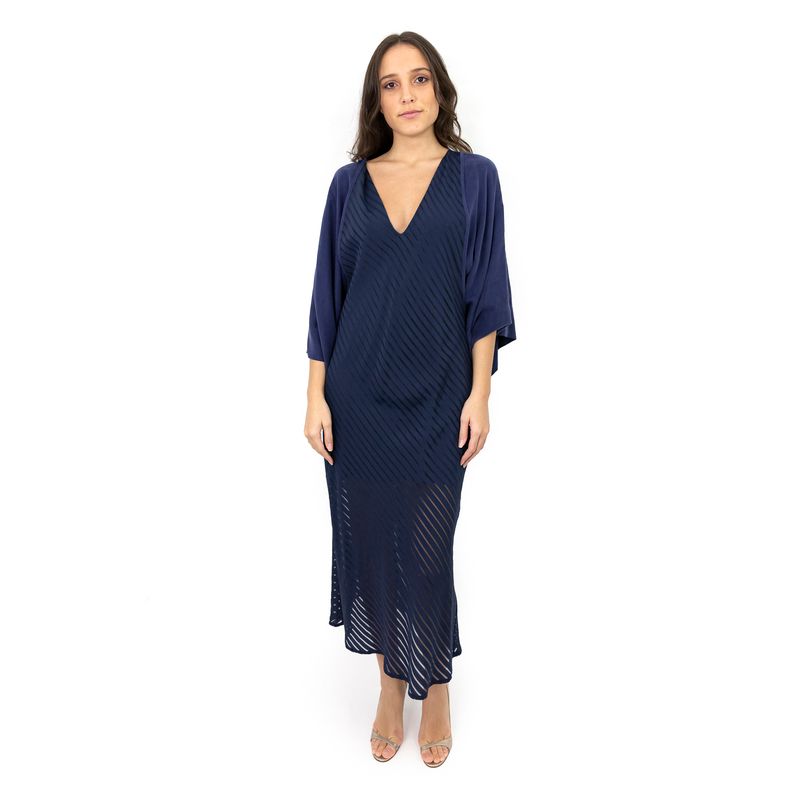 Vestido mídi da marca A Niemayer, tamanho 38 BR, confeccionado em viscose azul marinho e detalhe com transparência. O modelo não conta com fecho. Encontra-se em perfeito estado de conservação, sem sinais de uso aparente.