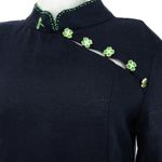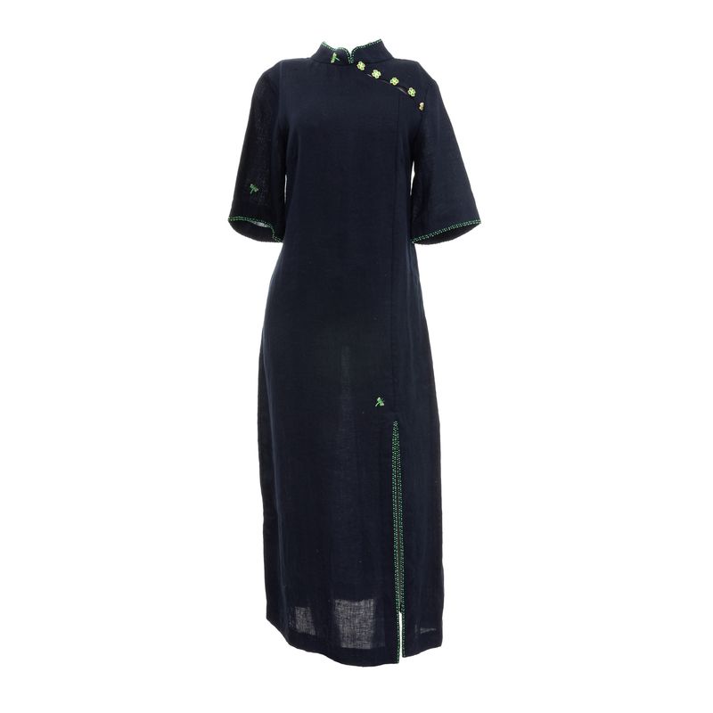 Vestido da marca Alix, modelo Noriko. Confeccionado em linho na cor azul marinho, com aplicações verdes nas barras, corte nipônico e aplicação de contas em forma de trevo. A peça se encontra em excelente estado, muito bem conservada.