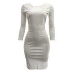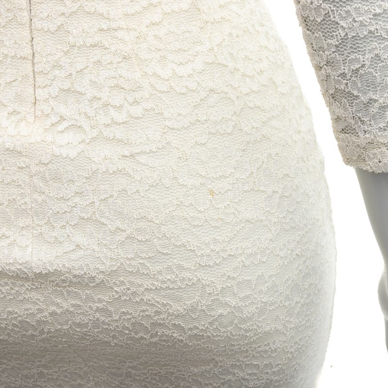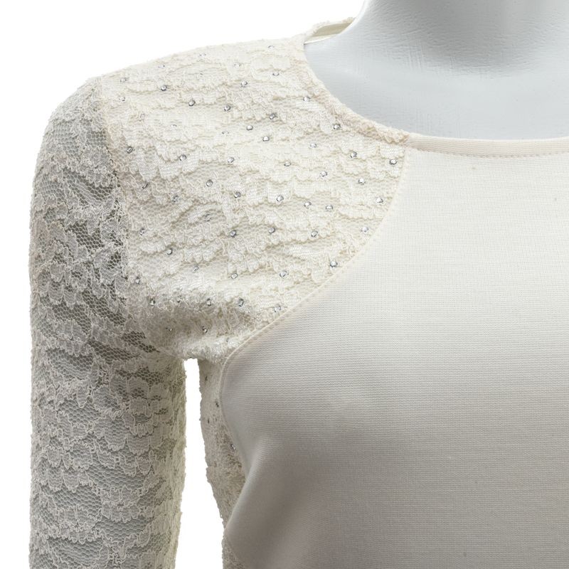 Vestido da marca Blumarine. Confeccionado em viscose na cor branca, manga longa, detalhes de renda e strass, fecho por zíper. A peça se encontra em ótimo estado, com levíssimas marcas de uso.