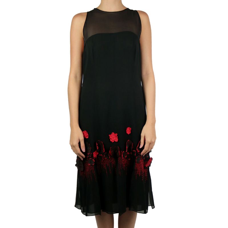 Vestido da marca Chanel, tamanho 40, confeccionado em crepe de seda preto com aplicações de flores vermelhas em 3D e babados na barra. O vestido conta com fecho por meio de zíper invisível nas costas. Encontra-se em excelente estado de conservação, sem sinas de uso.