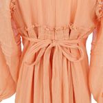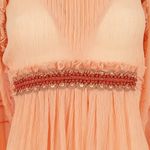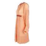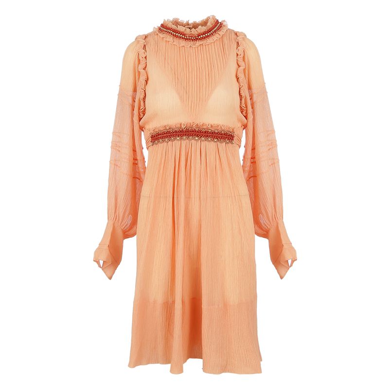 Vestido da marca Cholé. Confeccionado em tecido coral, com mangas compridas e aplicações na cintura e no pescoço. Possui fecho por meio de zíper invisível. A peça se encontra em ótimo estado, com levíssimas marcas de uso.