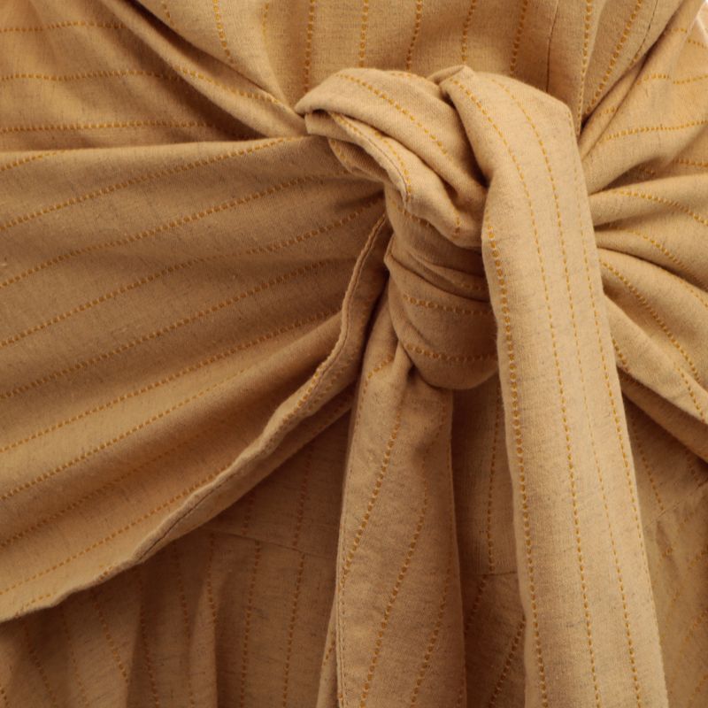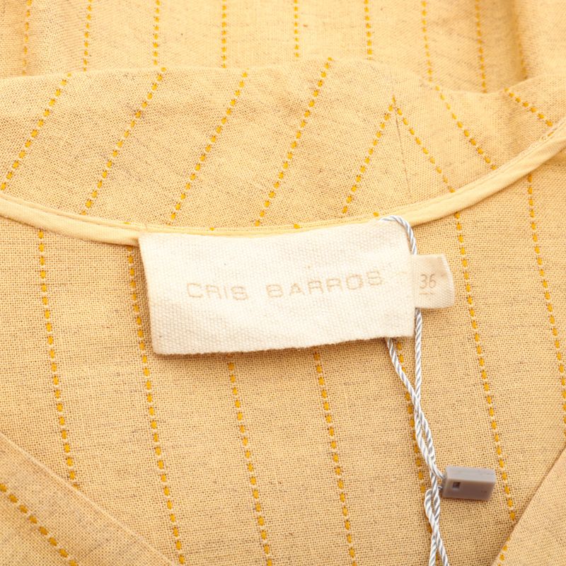 Vestido da marca Cris Barros. Confeccionado em viscose, linho, algodão e poliéster na cor amarela e linhas de pesponto amarelo escuro. Modelo curto, com manga 3/4, elástico na manga, decote "v", faixa fixa no quadril para amarração e fecho de botões e zíper na lateral. A peça se encontra em ótimo estado, com leves marcas de uso.
