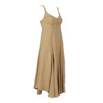 Vestido da marca Cris Barros. Confeccionado em acetato na cor bege. O vestido midi possui costura na cor marrom dando destaque a silhueta, é acinturado e amplo na barra e possui fecho por zíper atrás. Não possui mangas. A peça se encontra em excelente estado, muito bem conservada.