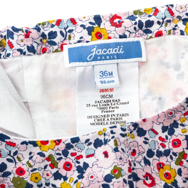 Vestido infantil da marca Jacadi Paris. Confeccionado 100% em algodão, em estampa floral. Possui forro interno, leves plissados frontais e fecho por botões nos punhos e por todo o comprimento traseiro. A peça se encontra em excelente estado, muito bem conservada.