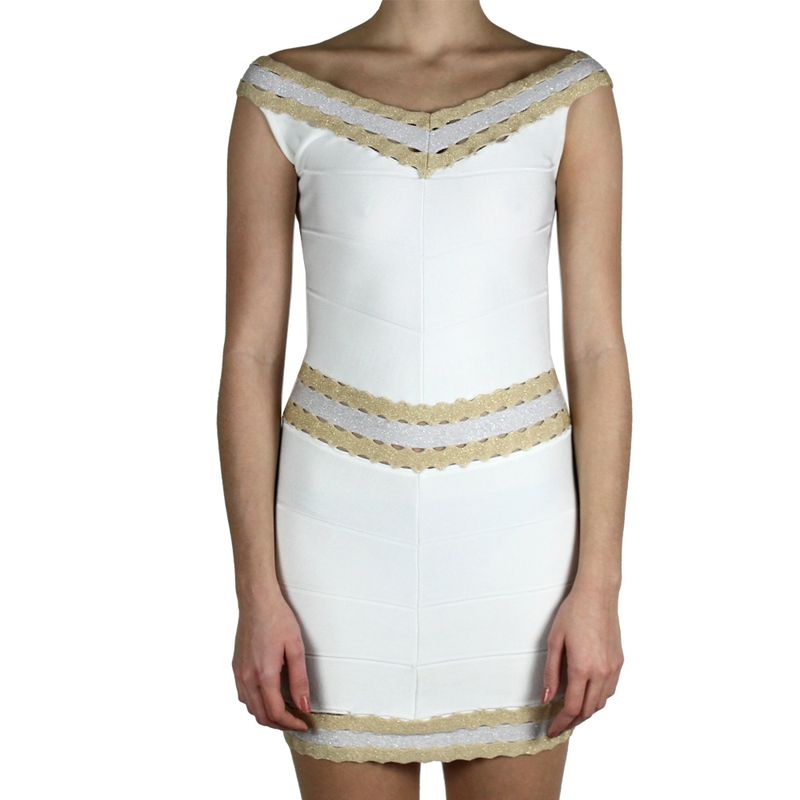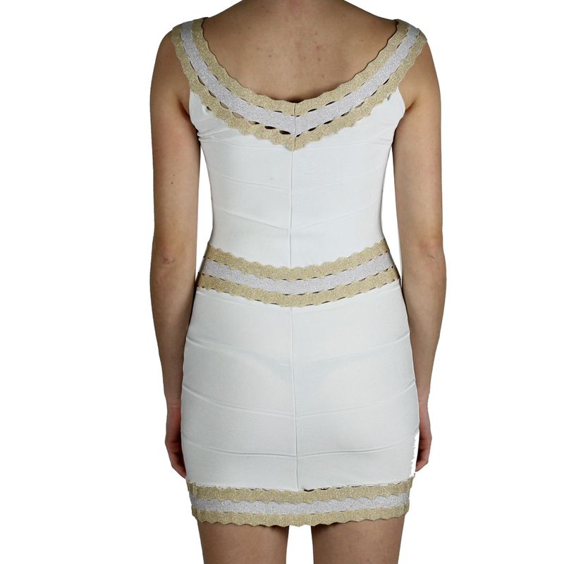 Vestido curto da marca Lolitta tamanho M, confeccionado em bandage branco com detalhes dourado e prata de brilho. Modelagem ajustada ao corpo, veste um 34/36BR. Em ótimo estado de conservação, usado apenas uma vez.
