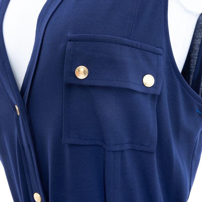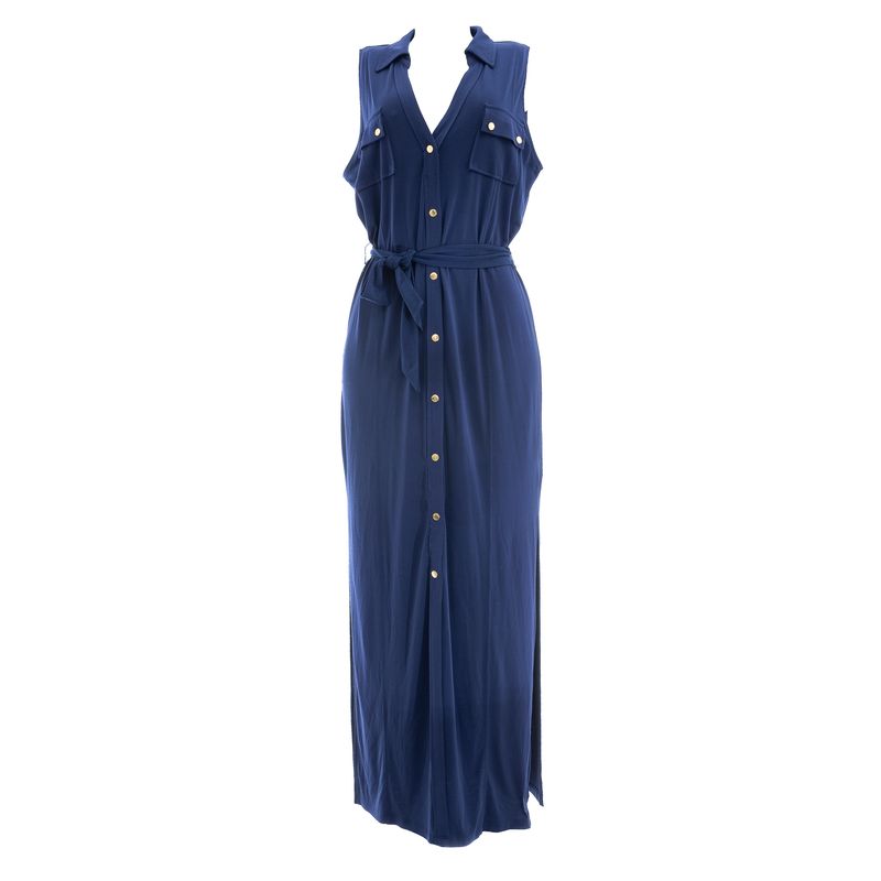 Vestido da marca Michael Kors. Confeccionado em tecido poliéster na cor azul marinho, modelo longo com botões dourados, com fendas, dois bolsos frontais e faixa de amarração. Tamanho G. Peça nova, encontra-se em perfeito estado.
