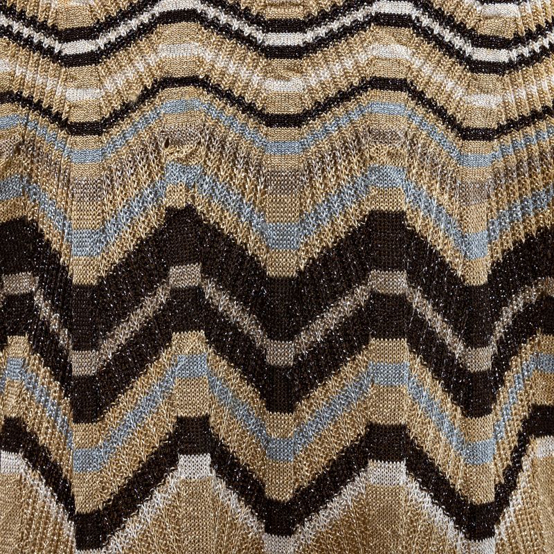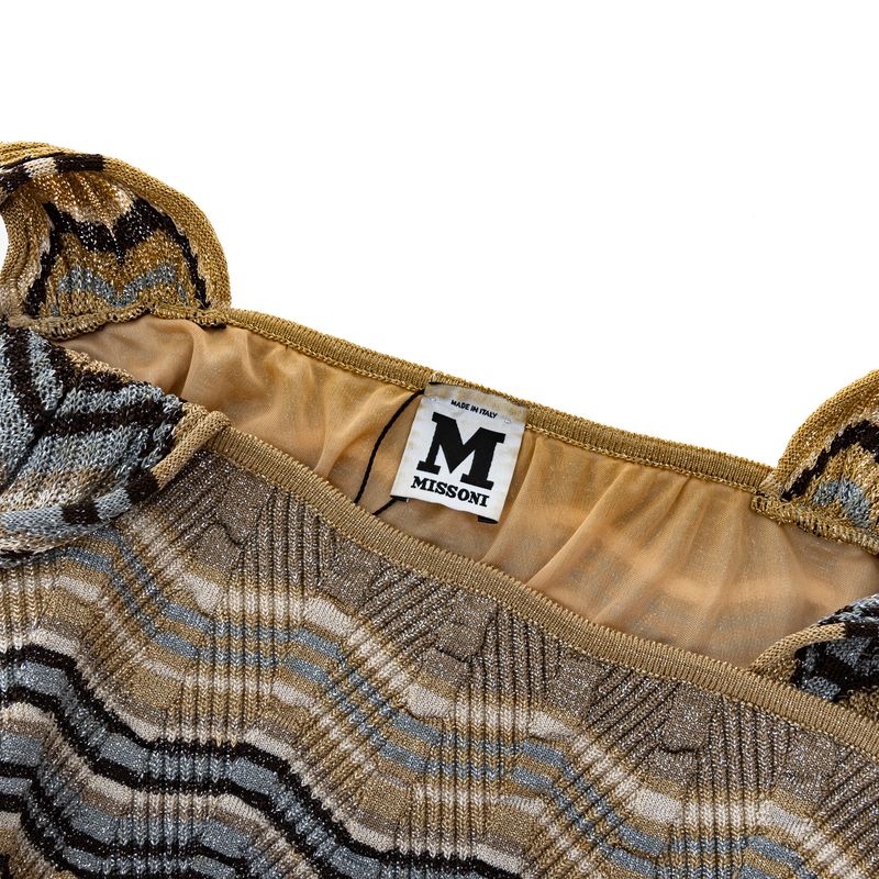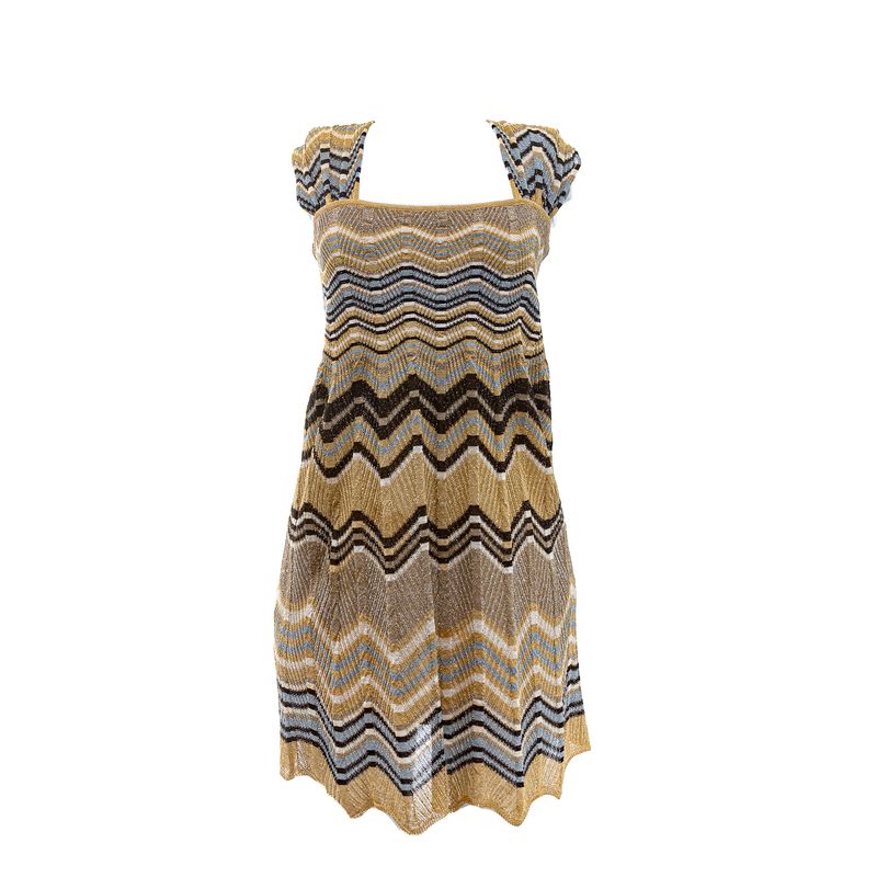 Vestido da marca Missoni. Confeccionado em tricot nas cores dourado, marrom e cinza, comprimento curto, decote reto. A peça se encontra em bom estado de conservação, com alguns fios puxados.