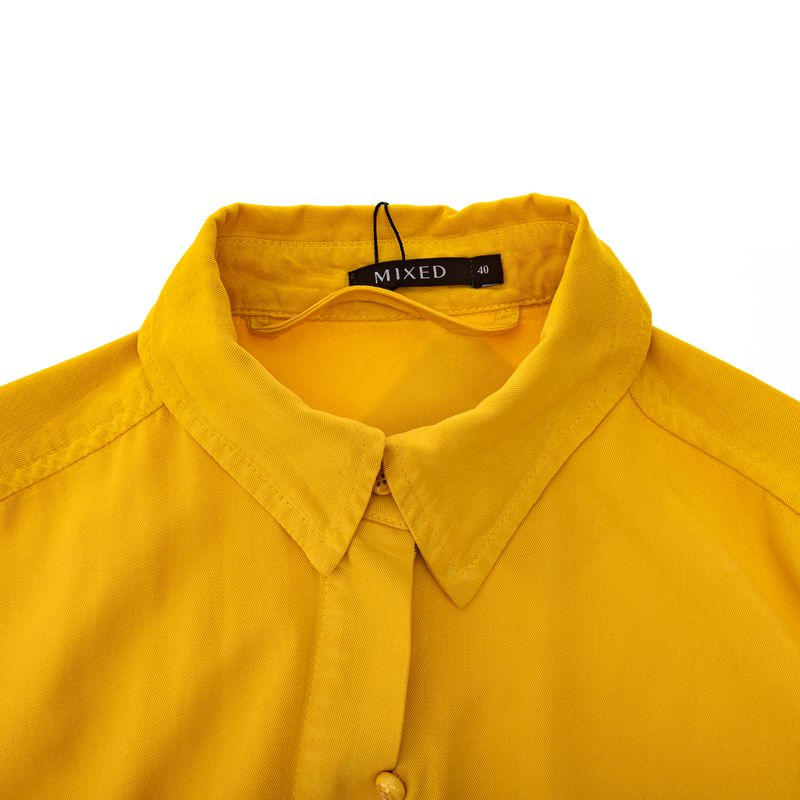 Vestido da marca Mixed. Confeccionado em liocel na cor amarelo chemise, mangas longa com elástico nos punhos, dois bolsos laterais, comprimento mídi e fechamento por botões. Acompanha faixa de amarração. A peça se encontra em ótimo estado, com levíssimas marcas de uso, com manchinhas frontais. A peça se encontra em ótimo estado, com levíssimas marcas de uso.