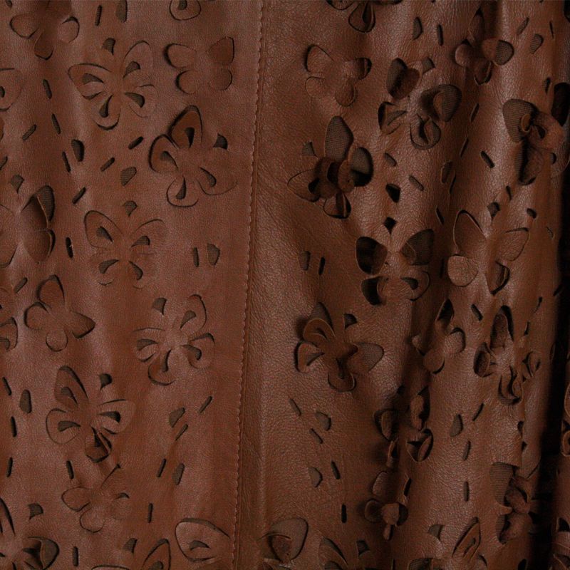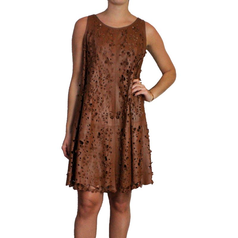 Vestido curto da marca Patricia Motta tamanho 40 BR, confeccionado em couro marrom com recortes a laser em formato de flor. Possui forro marrom e não possui fecho. Se encontra em ótimo estado de conservação. Os melhores vestidos de marca estão na Prettynew.