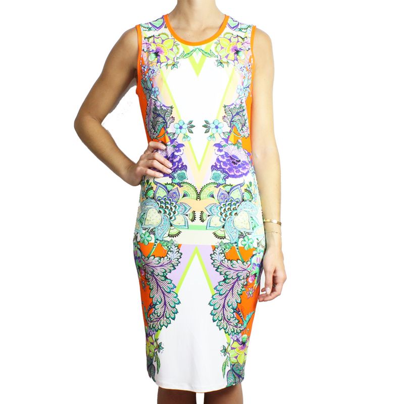 Vestido da marca Roberto Cavalli confeccionado em malha e estampado em tons de laranja, roxo e verde. O vestido possui modelagem justa e encontra-se em ótimo estado de conservação. Aproximadamente tamanho 40 Brasil.