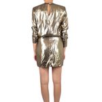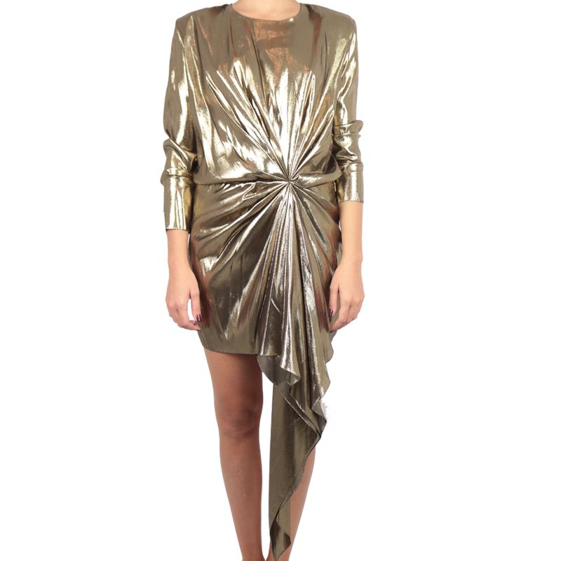 Vestido da marca Saint Laurent, tamanho aproximadamente 38/40 BR, confeccionado em tecido metalizado dourado. O modelo conta com detalhe drapeado na frente e fecho por meio de botão nas costas. Encontra-se em perfeito estado de conservação.