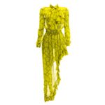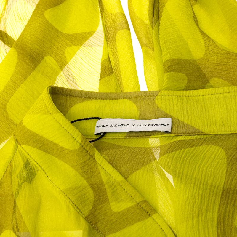Vestido da marca Vanda Jacinto com Alix Duvernoy. Confeccionado em seda estampada com dois tons de verde. Modelo com saia assimétrica, tecido com transparência. Acompanha hot pants bege. A peça se encontra em ótimo estado, com levíssimas marcas de uso.
