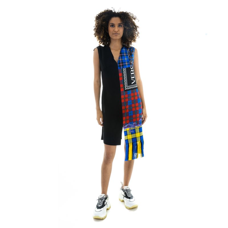 FemininoRoupasVestidosVestido Versace Preto com Xadrez e Franjas