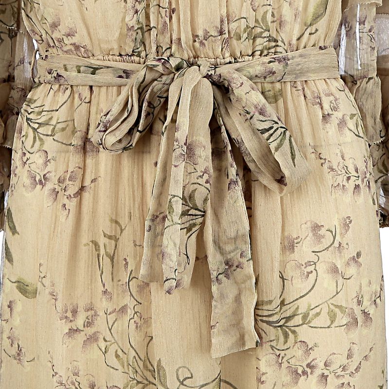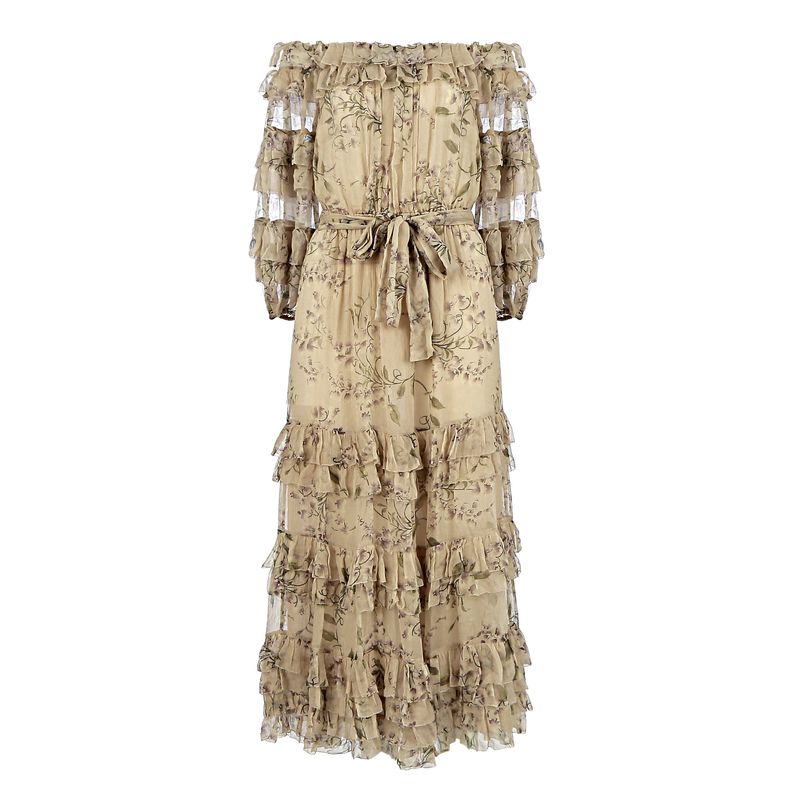 Vestido da marca Zimmermann. Confeccionado em seda, com estampa florida em lavanda, verde e bege. O modelo é ombro a ombro com babados nas mangas e no comprimento. Peça nova, encontra-se em perfeito estado.